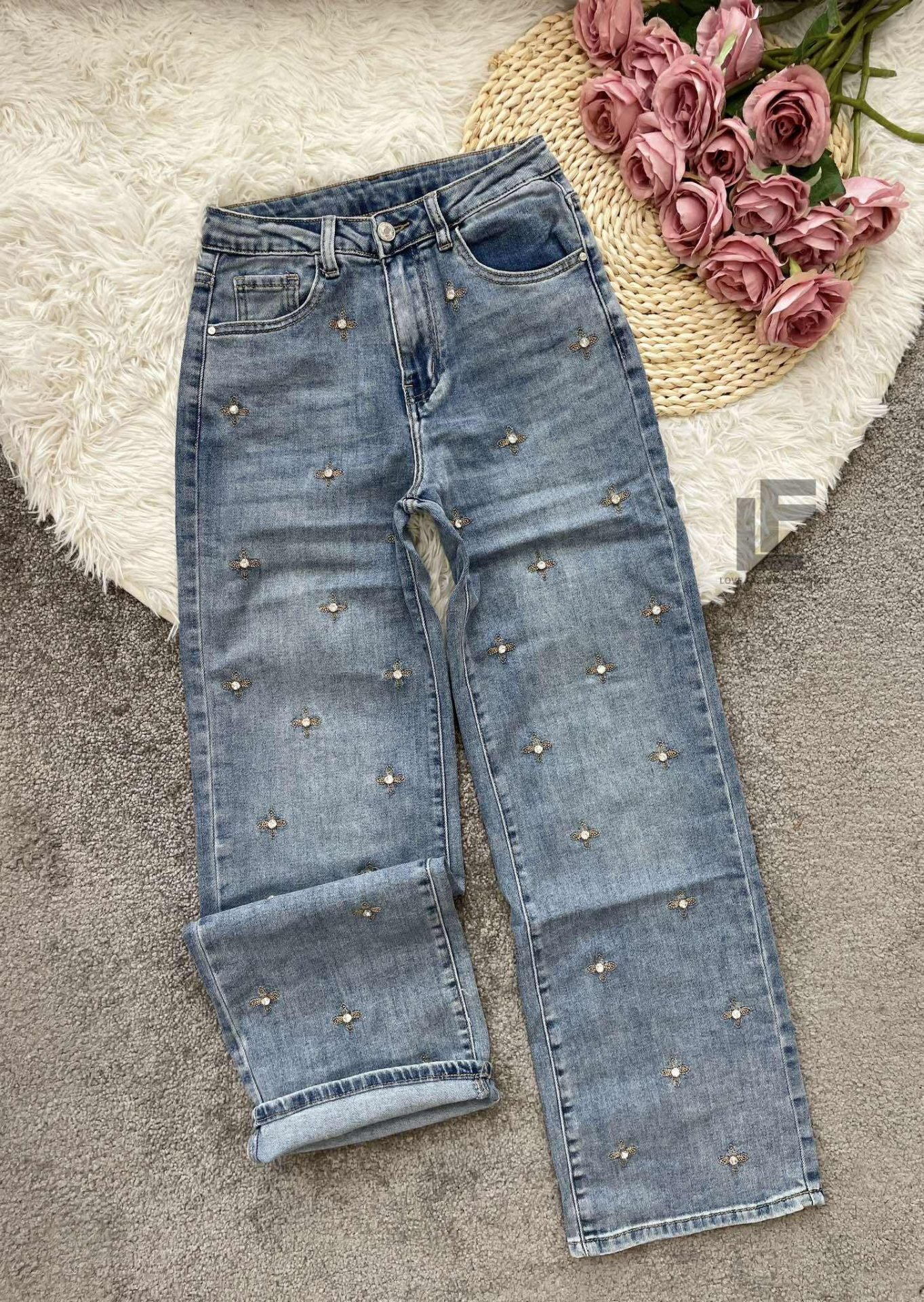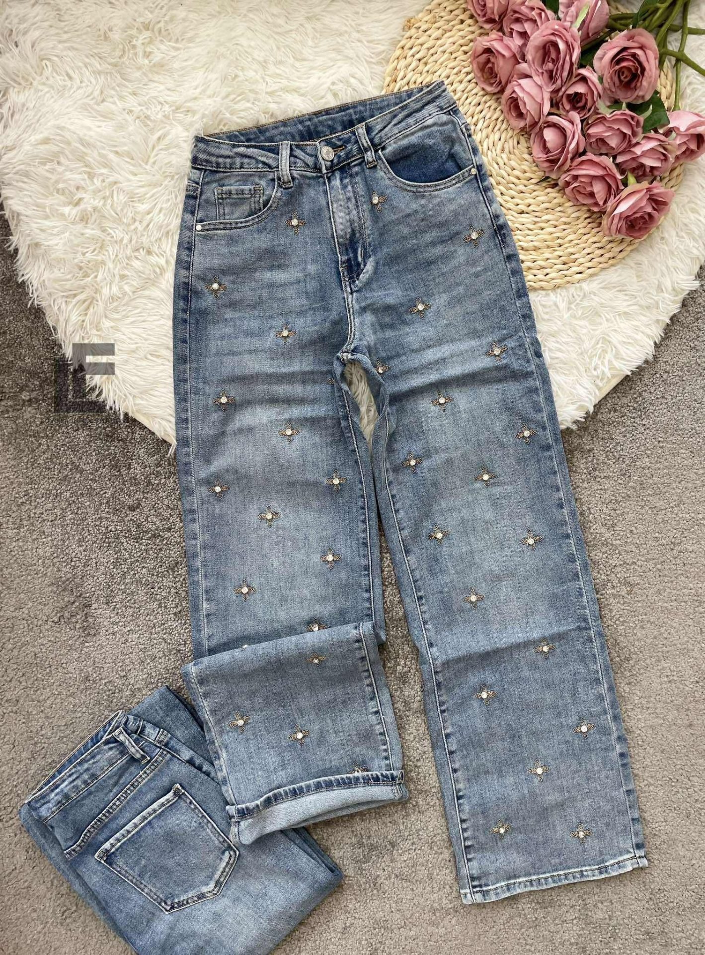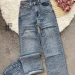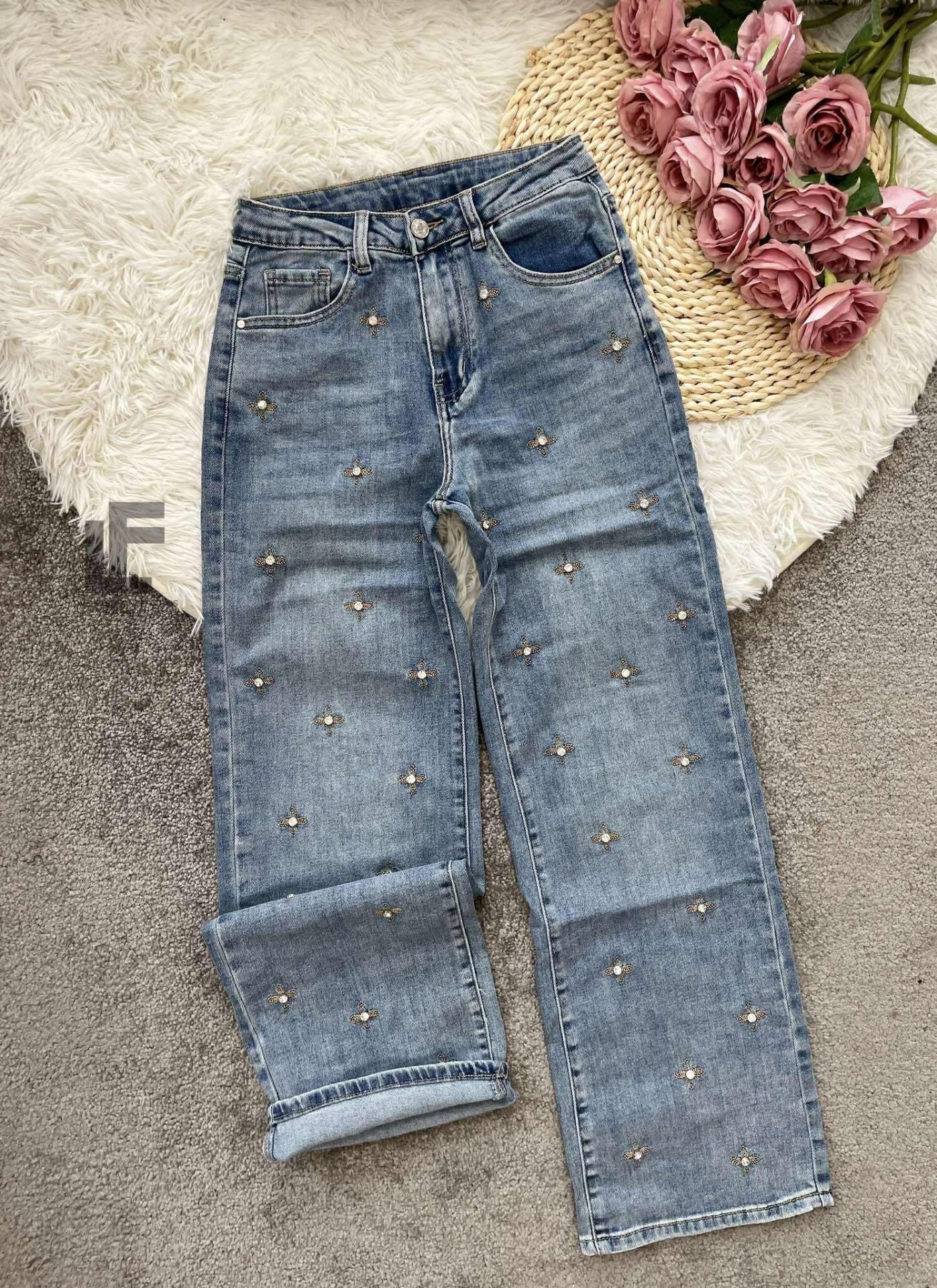 Кройка: Кройката е с прави, широки крачоли, издължаваща, средна към висока талия, декорирана с камъчета и бродерии