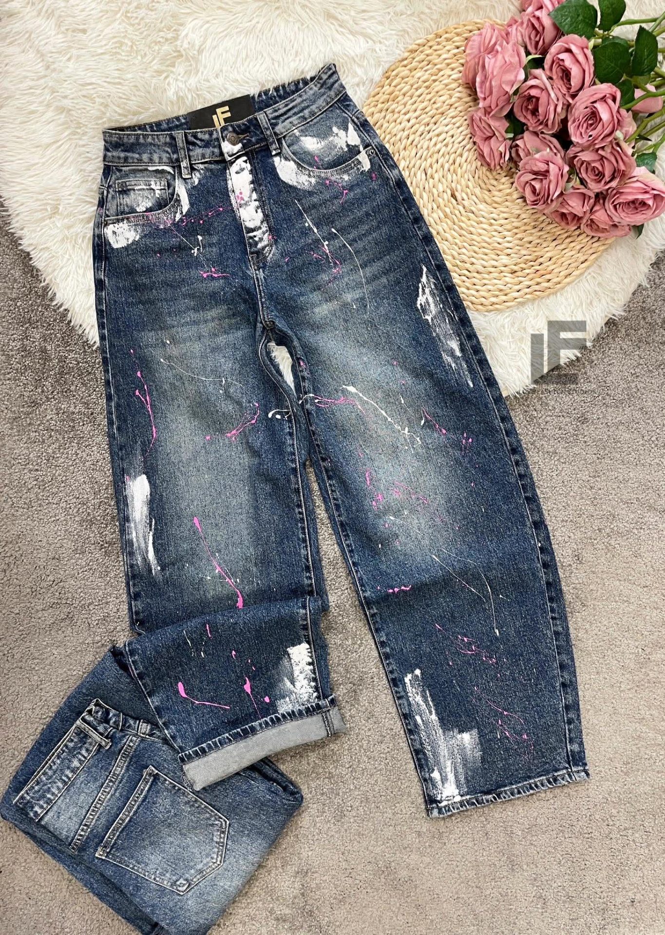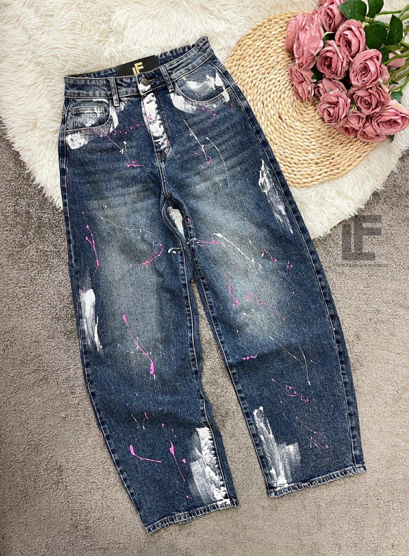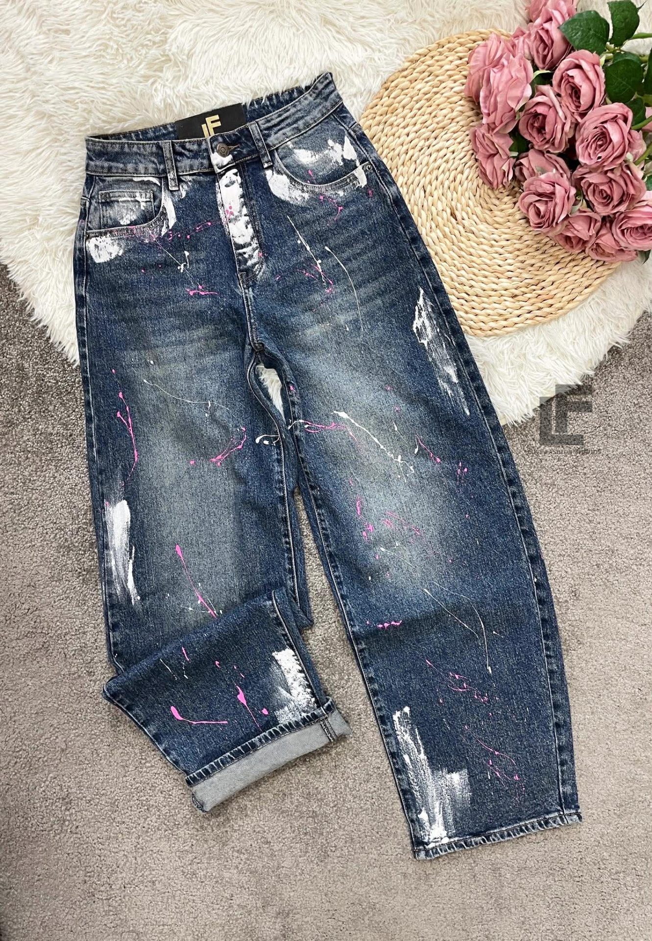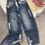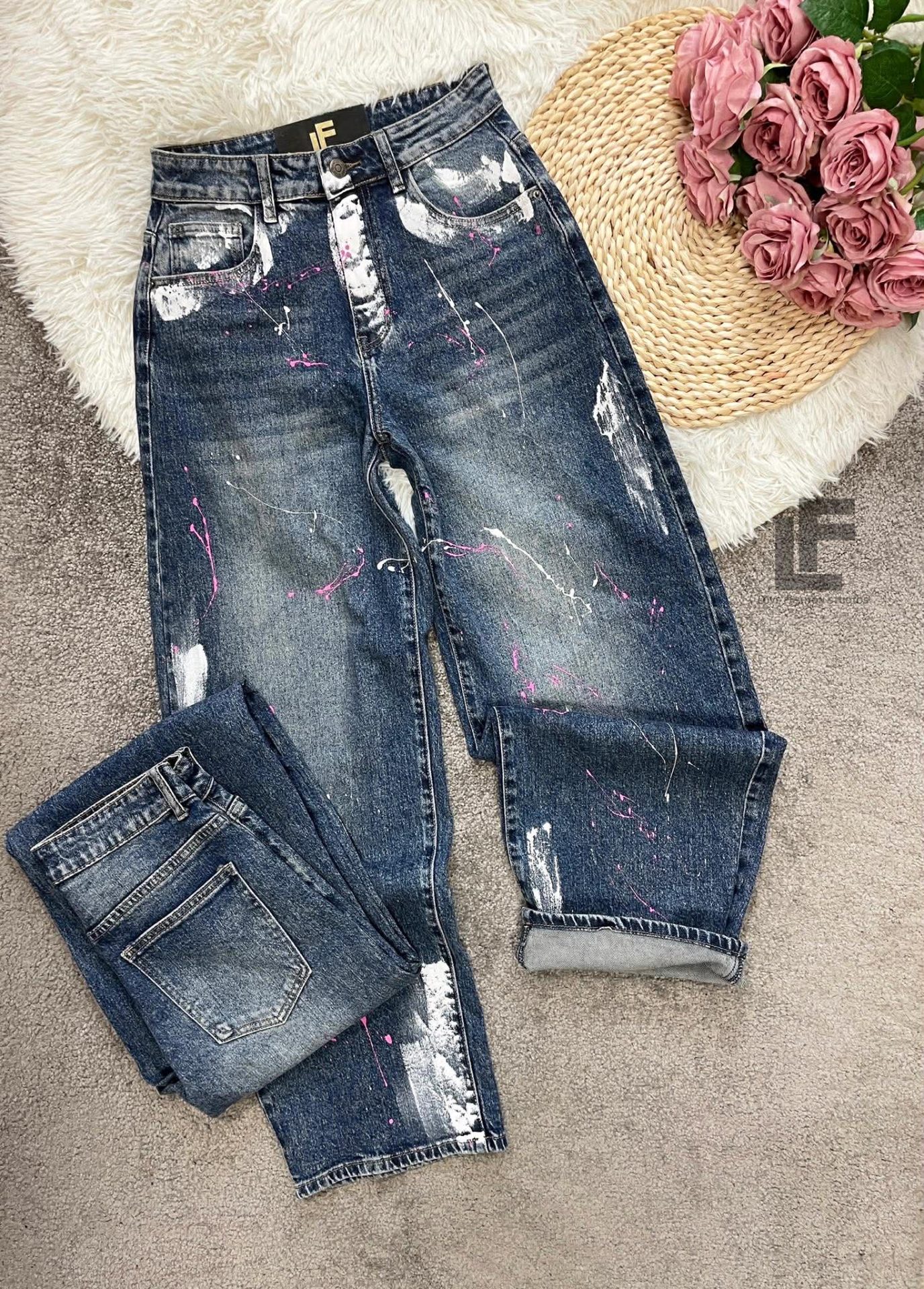 Кройка: Кройката е с прави, широки крачоли, издължаваща, средна към висока талия, ръчно рисувни
