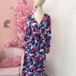Кройка: Кройката е свободна в горната част с ефектно деколте и разкроена, плисирана в долната част, с коригиращ се колан от същата материя