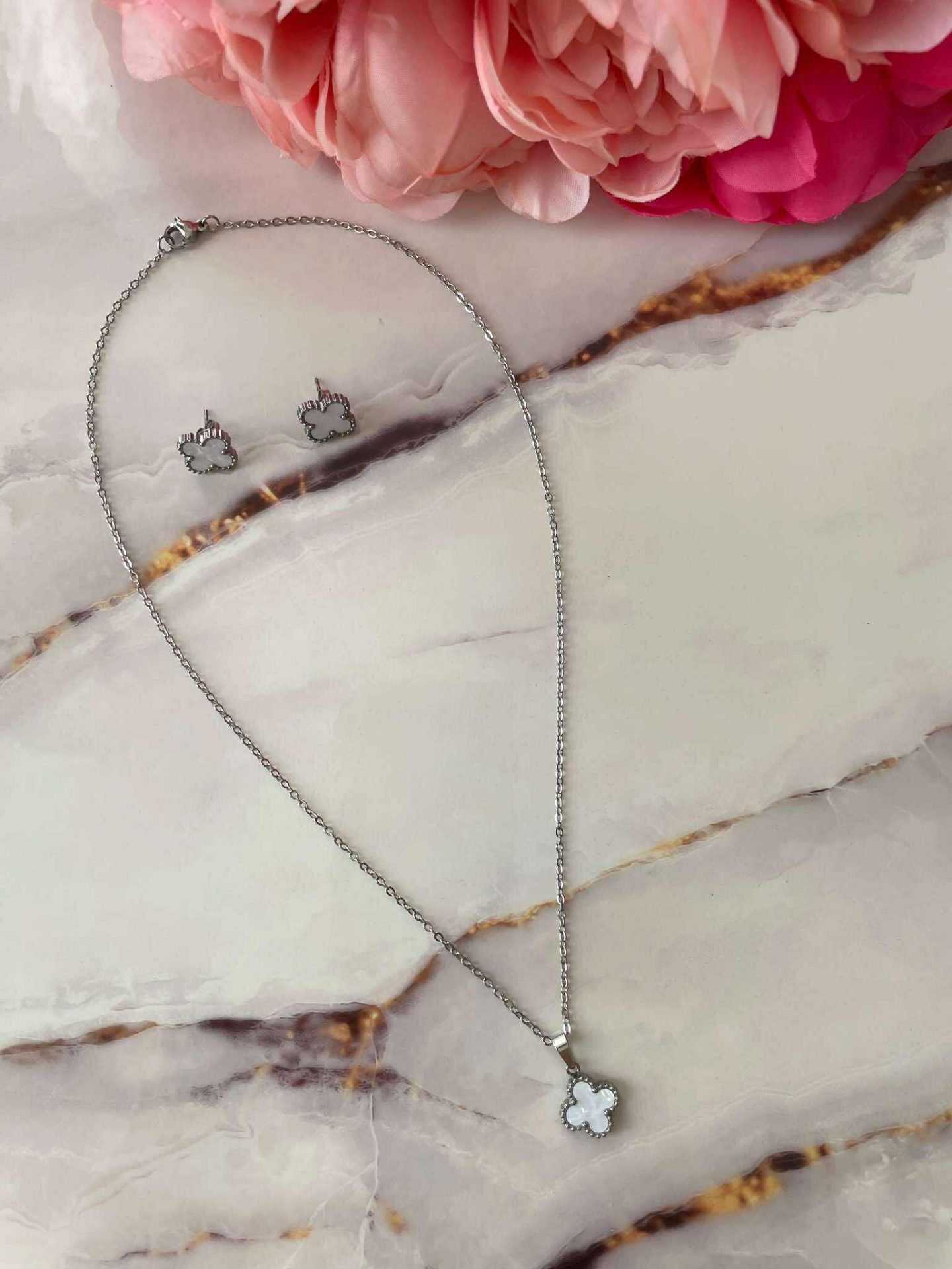 Дизайн: Цвят метал- сребрист, цвят декорация – бял . Сетът включва колие и обеци