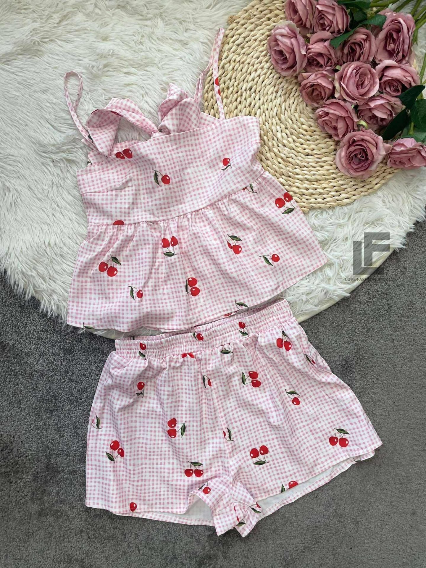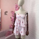 Кройка: Кройката на топа е свободна, с коригиращи се презрамки, ластик и коригиращи връзки на гърба. Кройката на панталонките е свободна с ластик на кръста, висока талия.