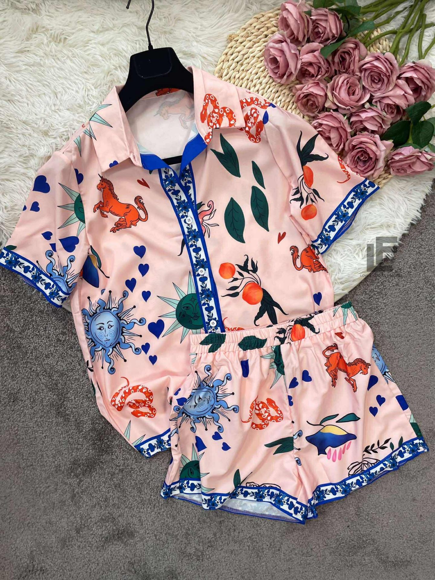 Кройка: Кройката на ризата е свободна, тип OVERSIZE. Кройката на панталонките е свободна с ластик на кръста, висока талия и коригиращи връзки