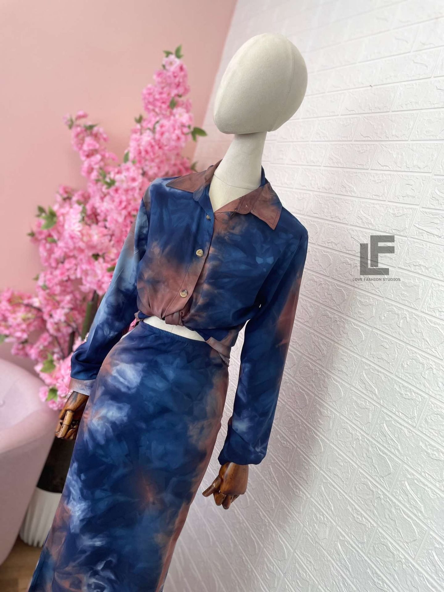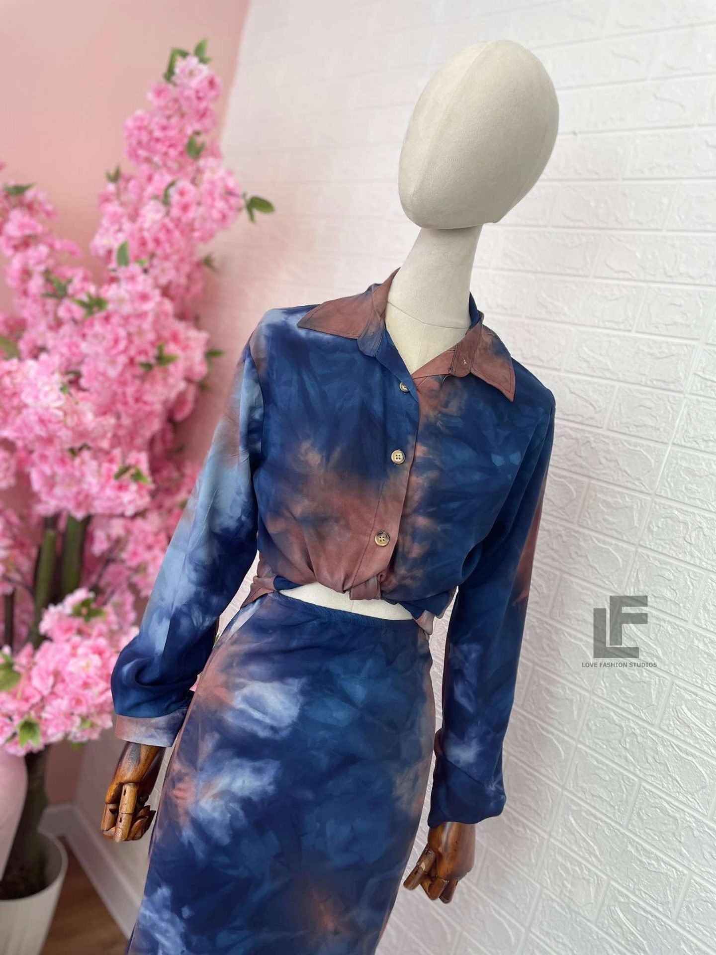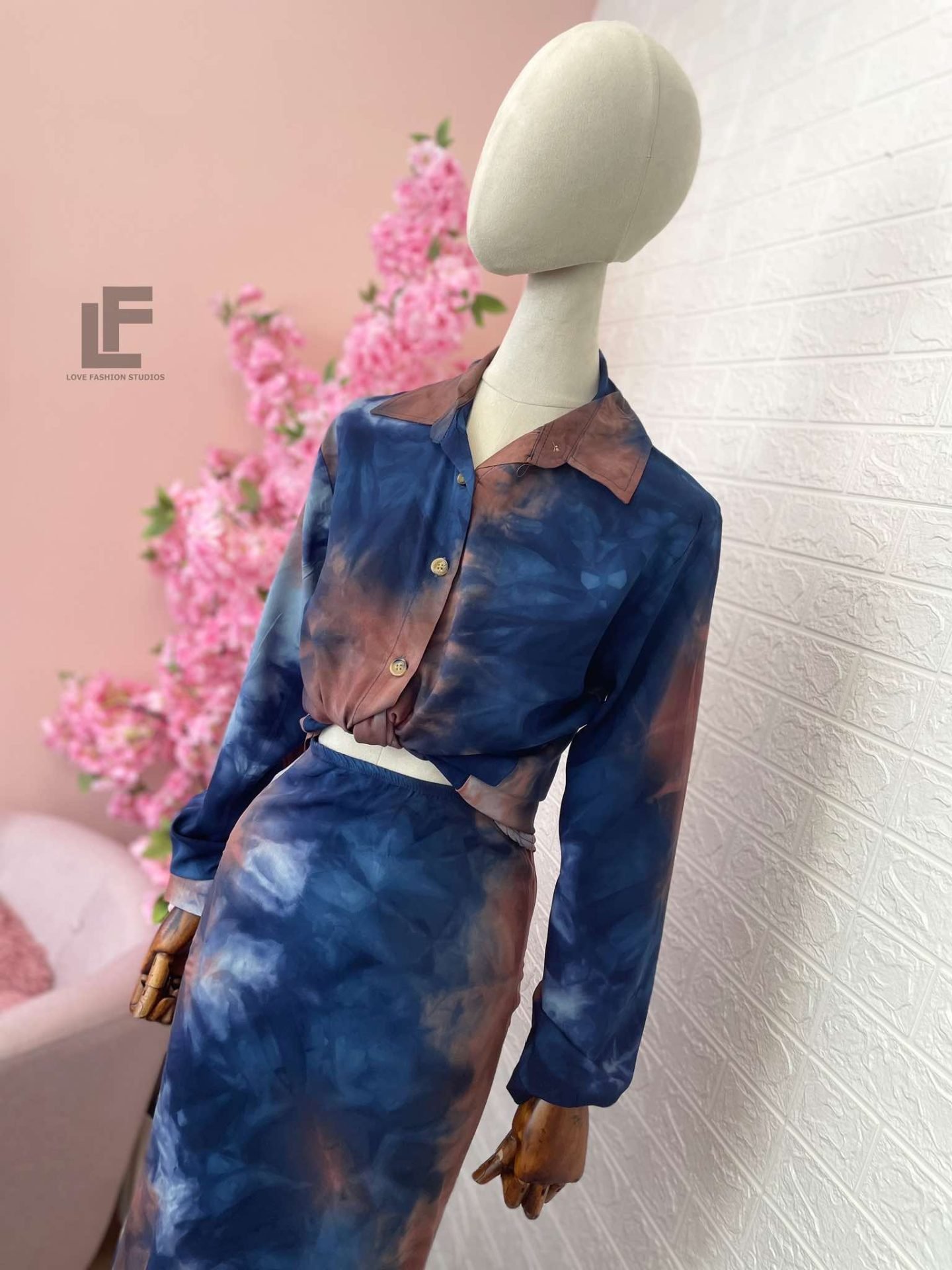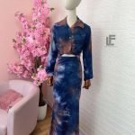 Кройка: Кройката на ризата е свободна, права, тип OVERSIZE.  Кройката на полата е слим в горната част (издължаваща) и разкроена в долната, с ластик на кръста, висока талия и цип